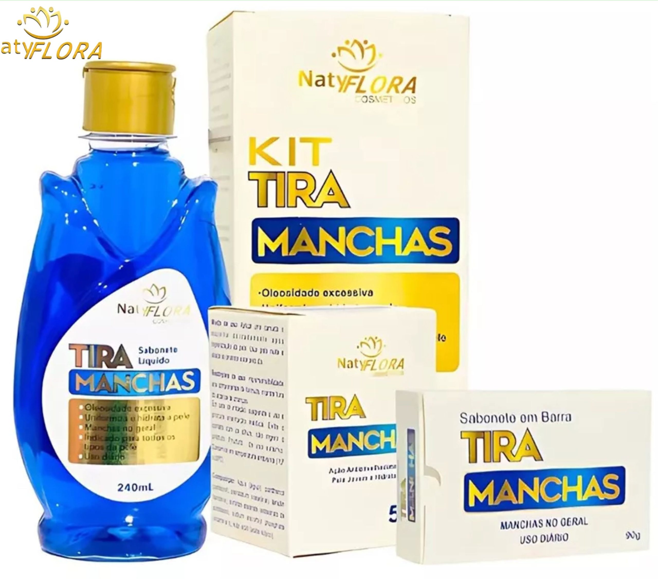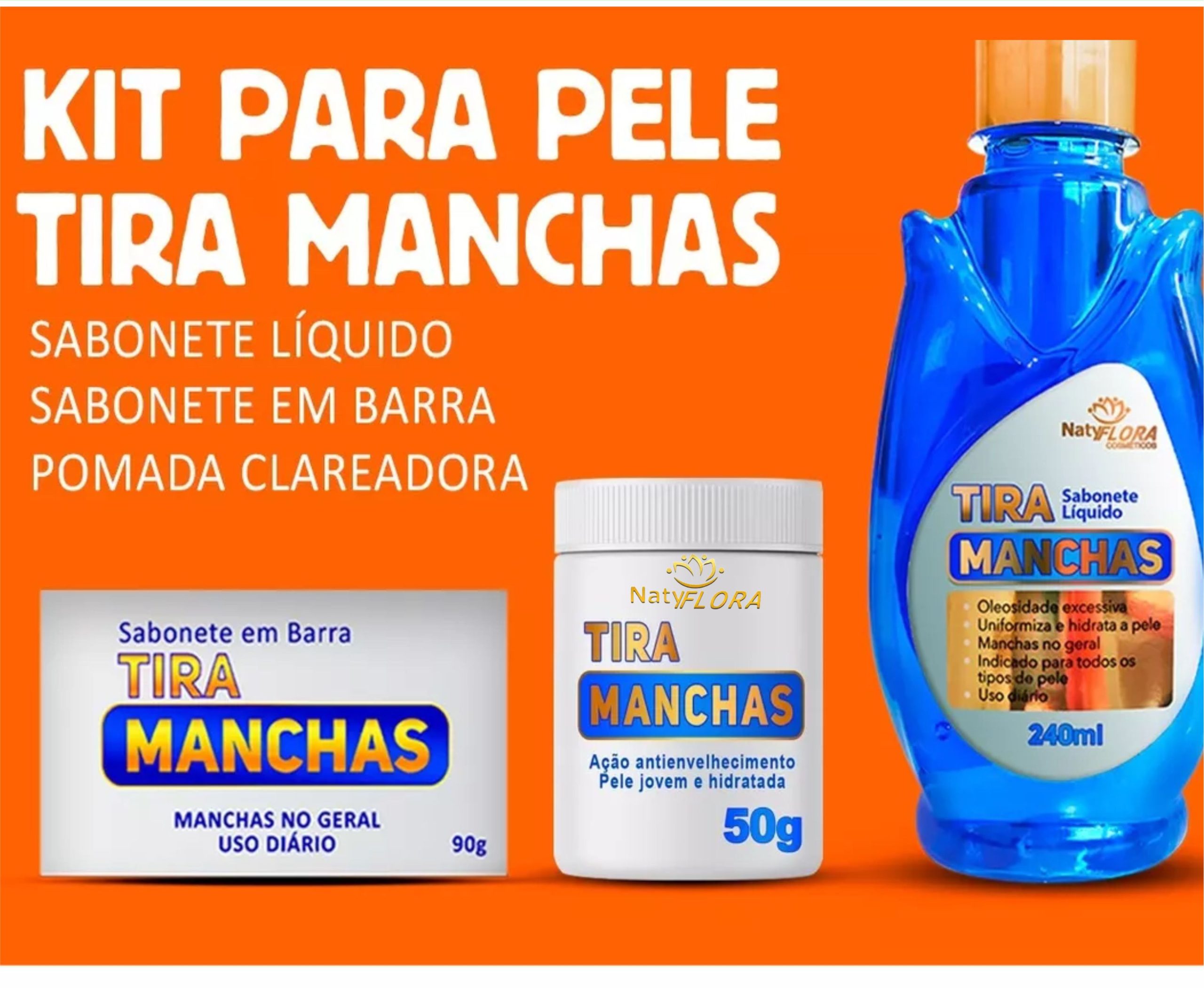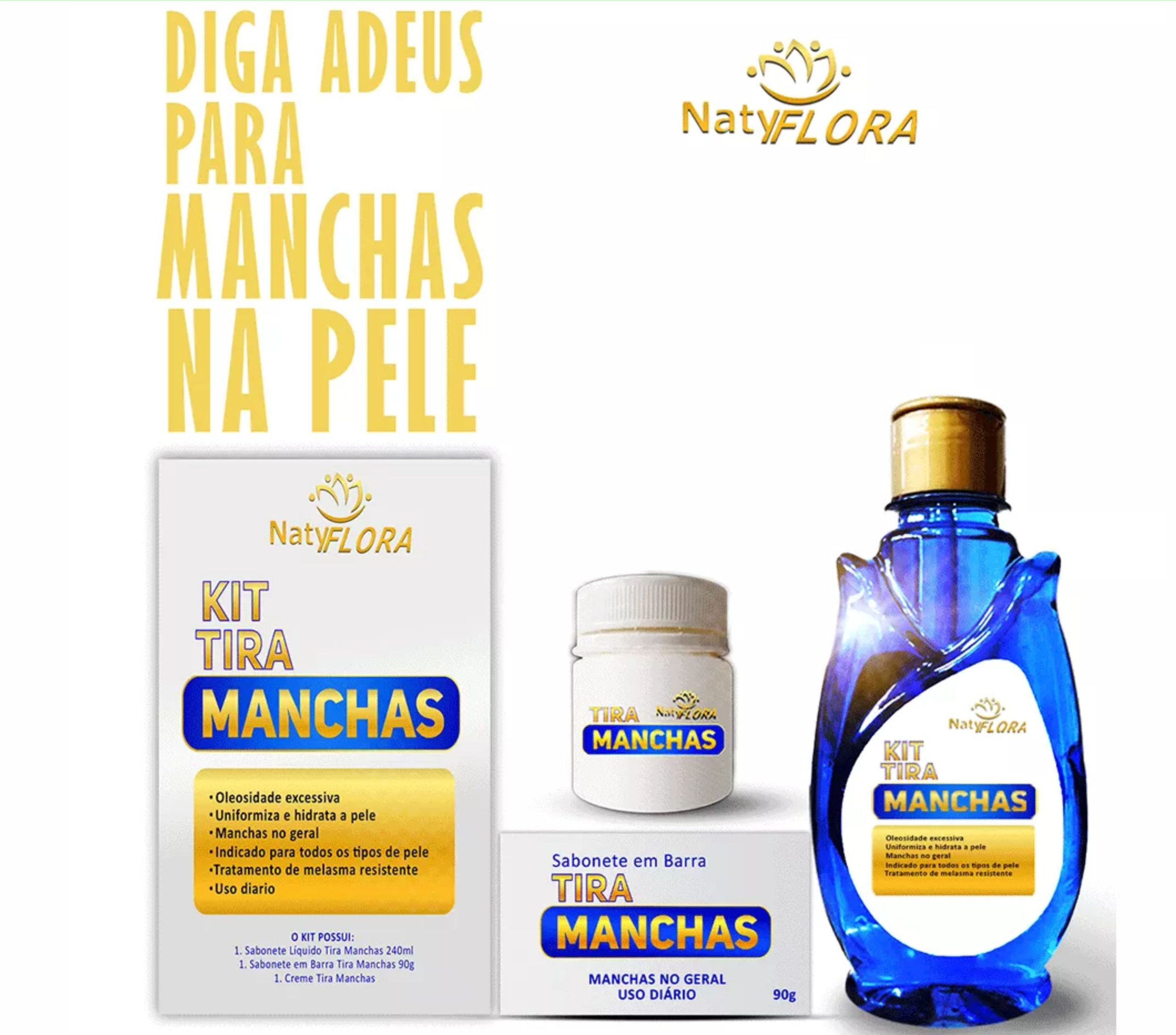 O Kit Tira Manchas NatyFlora, é composto por: 1 sabonete em barra 90g, 1 sabonete líquido 240mL e 1 pomada tira manchas 50g. Excelente para higienização, clareamento e rejuvenescimento da sua pele.
