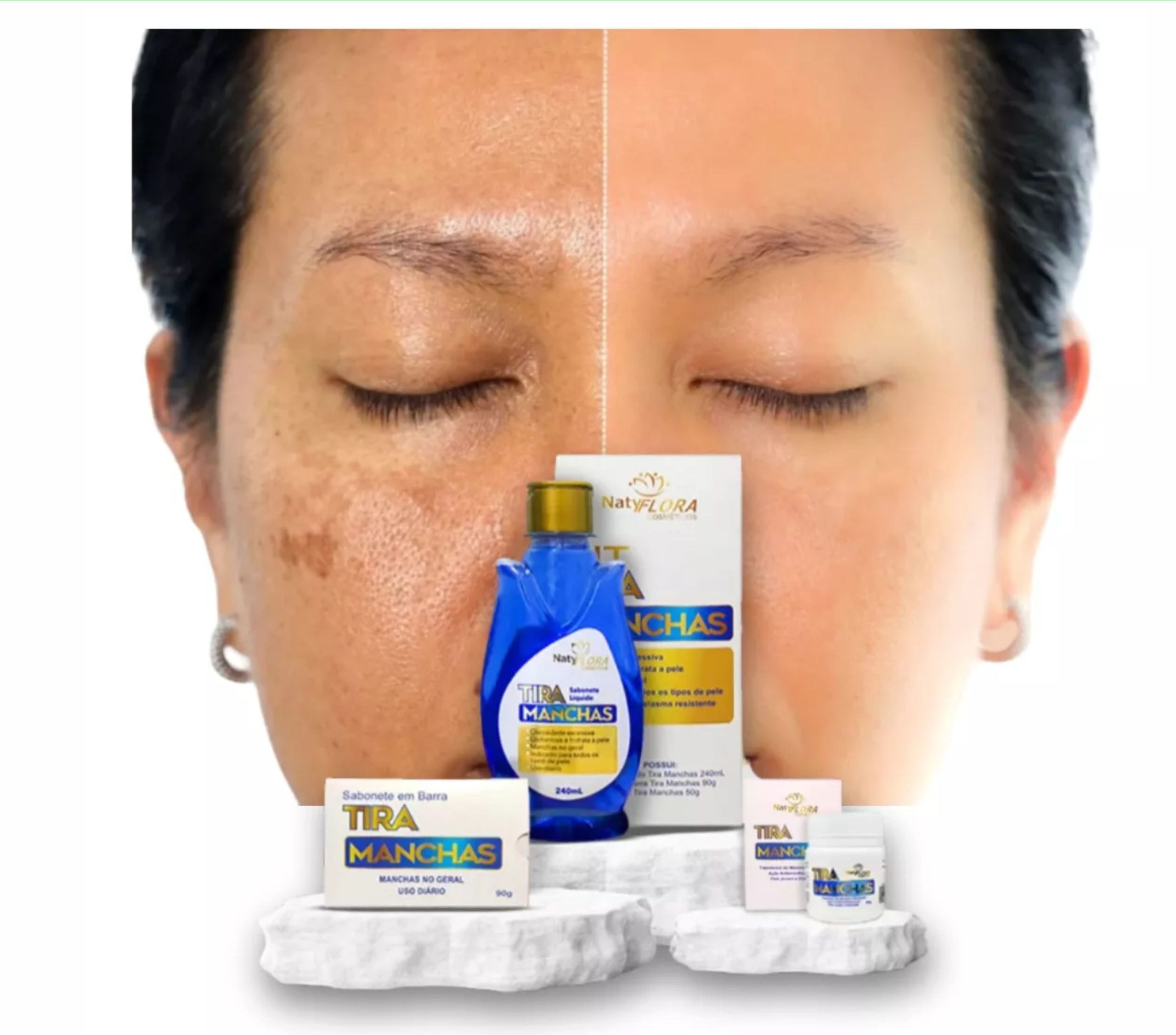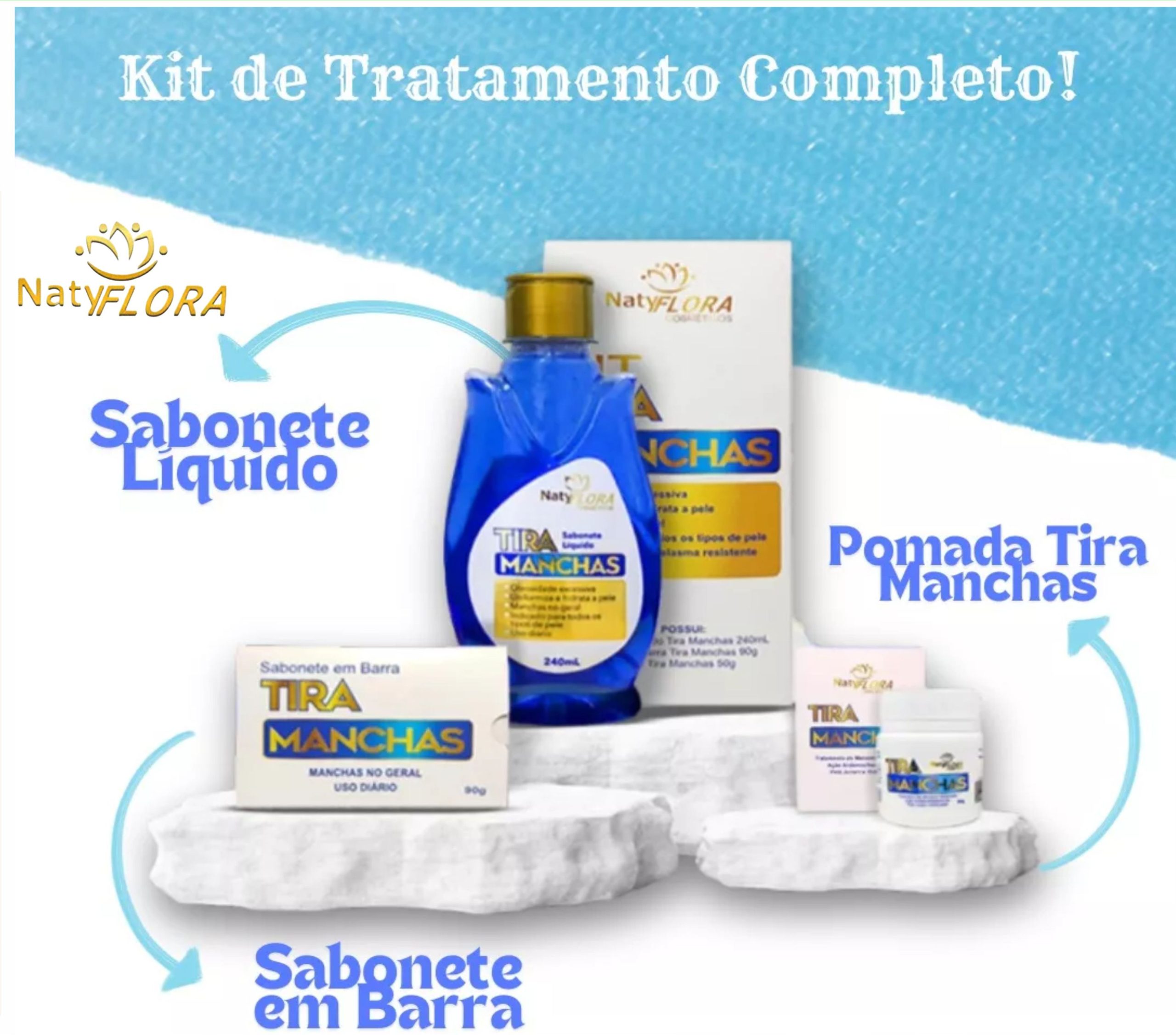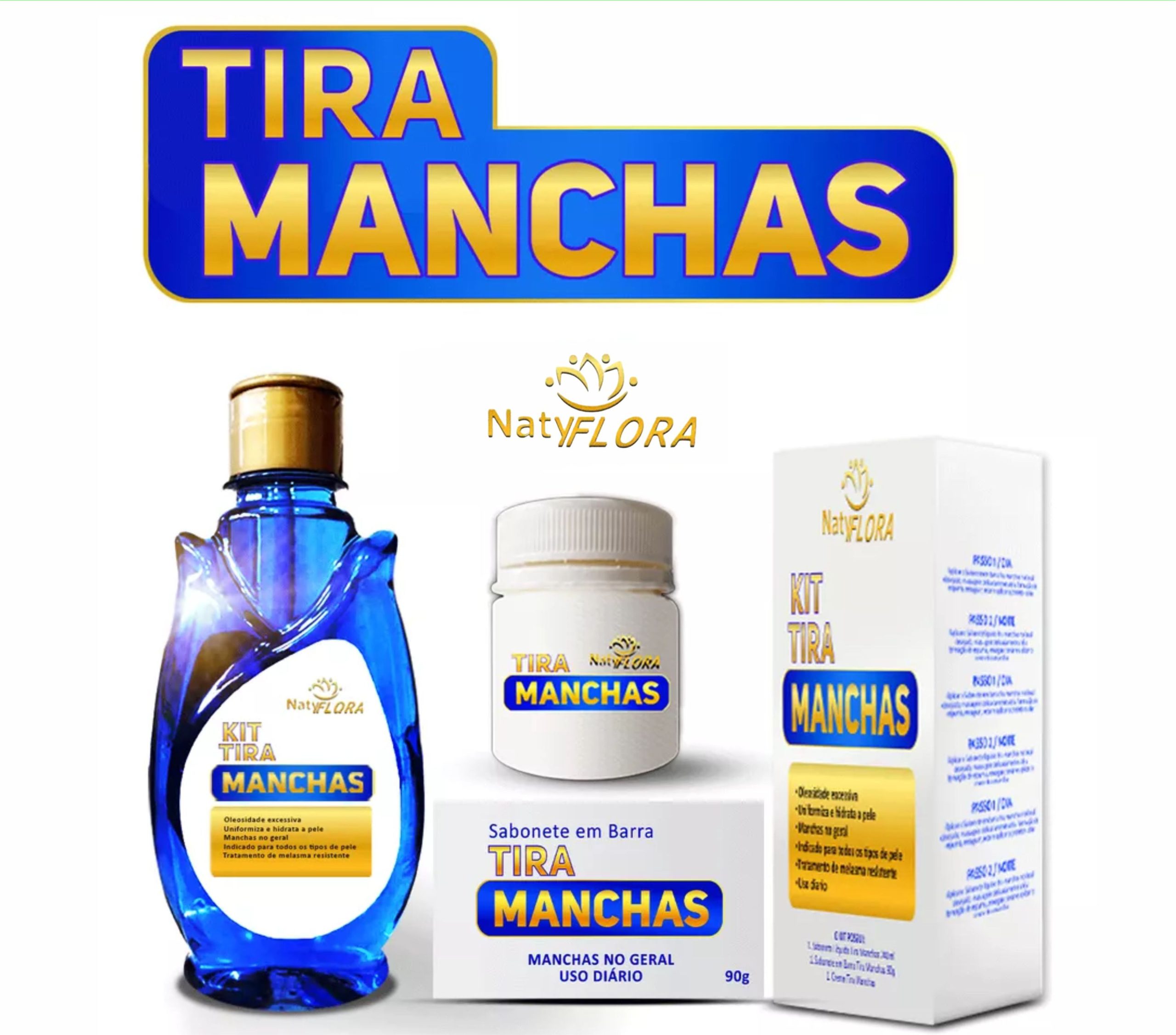 O Kit Tira Manchas NatyFlora, é composto por: 1 sabonete em barra 90g, 1 sabonete líquido 240mL e 1 pomada tira manchas 50g. Excelente para higienização, clareamento e rejuvenescimento da sua pele.
